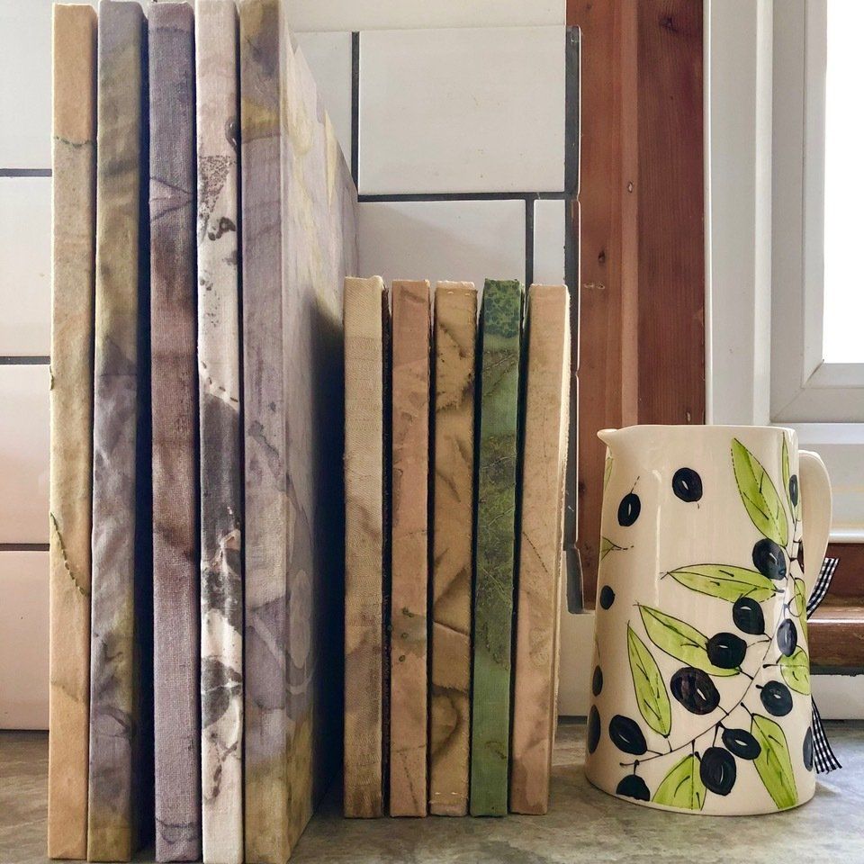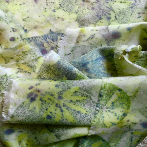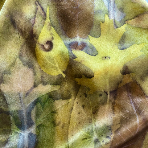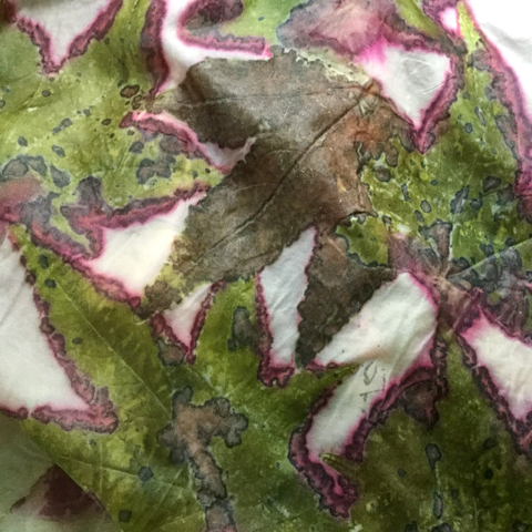 Ecoprint or Botanical Contact Print, this is a process of fixing natural leaf pigments from locally gathered leaves. Heat and pressure are employed in the transference of pigment. This is sometimes combined with natural dyestuffs.